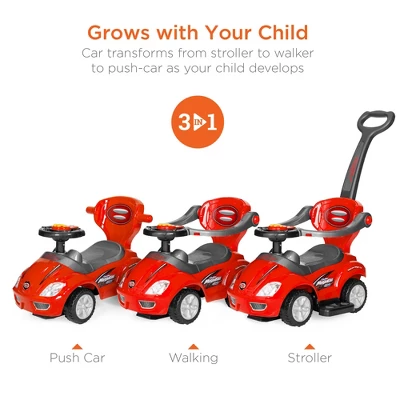 Adventures ahead! Turn morning walks into musical rides with a traveling companion that upgrades as your child grows. Your 3-in-1 car transforms from stroller to walker to push-car as your child develops. Your little one can even ring their favorite toy along for the ride or keep snacks and treats tucked away in the under-seat storage compartment. No car ride is complete without music – little drivers can enjoy a variety of tunes on their adventures. With this toy, you can trust in features like guard rails, ground catch, feet platform, and rail locks.