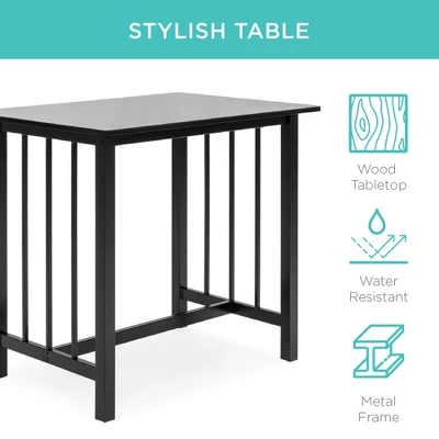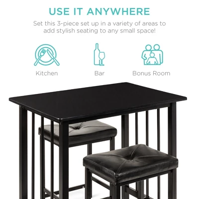 Introduce a space-saving design to your dining area with this cozy dining set. This counter-height set includes 2 stools that fit perfectly underneath the table to save space in any setting (Counter Height: 32.25in). The stylish, water-resistant table has a wood tabletop and metal frame. Plus, sturdy stools are made with faux leather and a metal frame. You can set this 3-piece set up in a variety of areas to add stylish seating to any small space! Use it in your kitchen, at the bar, or in the bonus room. Easy maintenance will also keep your set looking its best with smooth materials that can be effortlessly cleaned in no time!