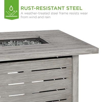 Turn up the heat and enjoy top-quality entertainment in your own backyard! This propane-powered Fire Pit table matches a pleasing profile with maximum utility. Your tank stays hidden under the pit thanks to a convenient side door. A weather-treated steel frame resists wear from wind and rain. Decorative glass beads add subtle style, while a burner lid increases table space for entertaining. A durable nylon cover ensures this fire pit table will withstand the elements. Whether you’re throwing a pool party or hosting dinner al fresco, this fire pit is the perfect centerpiece to entertain guests with outdoor dining and conversation!