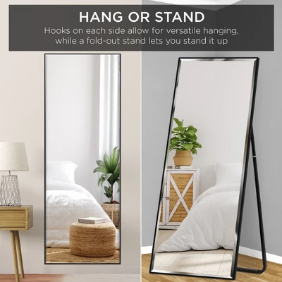 Simplicity and versatility at its finest. Perfect for horizontal or vertical use, you can set this mirror up vertically or horizontally for the perfect complement to any room setting. Elegant details include a crystal clear reflection and a sleek, ultra-thin frame that is designed with beveled edges for an elegant appeal. Hang or stand the mirror up, with hanging hooks on each side that allow for versatile hanging, while a fold-out stand with support hinges lets you stand it up on its sturdy, U-shaped stand. For your protection, this shatter-resistant mirror is safely designed with an anti-blast film that sticks to the glass to prevent shattered pieces from leaving the frame. Plus, for durability, it’s made of quality material – crafted with a rust-resistant aluminum alloy frame that is lightweight for easy movement.