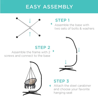 - Easy AssemblyStep 1: Assemble the base with two sets of bolts and washersStep 2: Assemble the frame with 2 screws and connect to the baseStep 3: Attach the steel carabiner and choose your favorite hanging seat